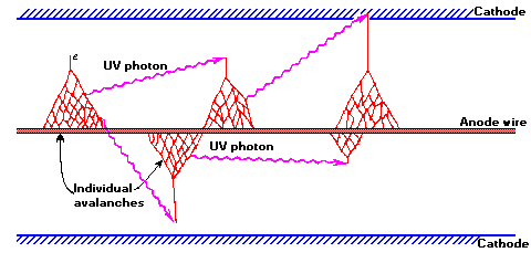 Figure 2. The mechanism by which additional avalanches are triggered in a Geiger-Mueller discharge.