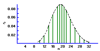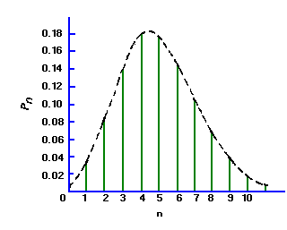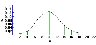 If the mean of a Poisson distribution becomes ~20, the distribution becomes symmetrical, assuming the characteristics of a Normal, or bell-shaped Gaussian distribution. This displays the characteristic that 68% of the total area of the distribution lies within ± sigma of the mean. For a Poisson distribution sigma=sqrt(µ) , so that a counting measurement is 68% likely to be within ± sigma of the true population mean µ Since x is probably close to µ, we may take sigma = sqrt(x), and say that a single measurement is 68% likely to be within ± sqrt(x) of the true mean. Similarly the values for ± 2 sigma and ± 3 sigma are 95% and 99.7%, respectively. When plotting experimental results, it is customary to include error bars of length sigma1 on each point xi.