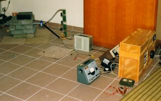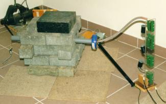 Heap of concrete blocks with tube inside, HV supply (green cascades) and voltmeter (black tube).