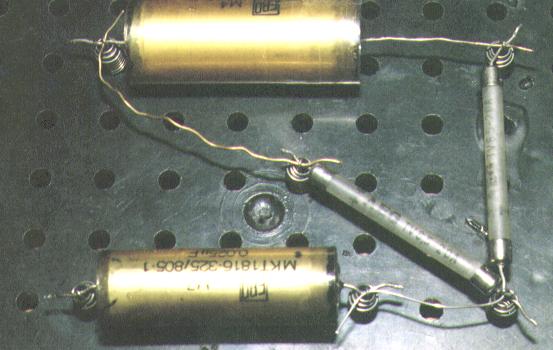 One-stage cascade built with 2 caps 25nF/8kV resp. 10kV and 2 TV rectifier rods. Useful to get a "medium" voltage of about 10kV out of the 5kV mains or 8kV 15kHz transformer, e.g. for static experiments.