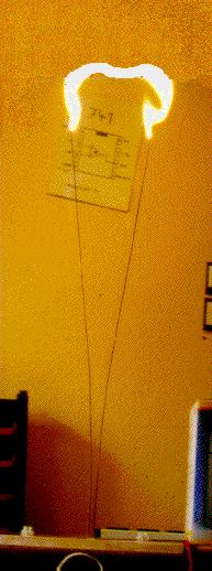 Jacob's ladder: two electrodes arranged in "V" shape. The arc is ignited at the point of smallest distance (bottom) and rises up till it reaches the end of the electrodes, gets too long and breaks off. Transformer: 4kV 2000VA mains. Photo: open shutter, ignite arc, wait till it has broken off, close shutter. Set the aperture to a high value (11 or 16). |