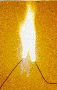 This is an arc produced with the 4kV 2000VA mains transformer . The electrodes are about 5cm apart. To ignite the arc, I brought a copper wire with long plastic handle between them; after the arc appeared, I pulled the wire away again. The arc has a upside-down-"V"-like shape, because the ionized air is extremely hot and therefore rises. If the electrodes were not bent upwards, the arc would not be stable because of this tendency to rise. Photo: nothing particular. The arc is bright enough to light the whole scene. |