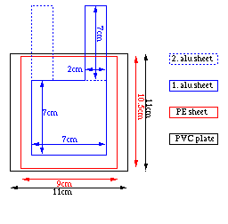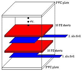 The stack consists of 20 insulating layers (each one having 10 sheets of 100microns PE foil) between 21 sheets of aluminium. I usesd the standard PE foil available in DIY markets (watch out for the thickness!), which is rather bad quality. Therefore you should have a close look at every sheet cut, and reject those with visible flaws (grains, small holes). I rejected nearly every fourth sheet. The dimensions should be taylored to your needs (e.g. the container you plan to use). It is important to have the PE sheets somewhat larger than than the aluminium ones - about 1cm at each edge, 2cm at the connection strips. When you cut the shhets, you will probably have most of them a mm or two shorter than planned. You can even out this by stacking every other PE sheet shifted a little. See the figures for dimensions I used.