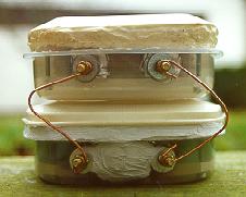 The capacity of the above "yoghurt container" cap is by far too low for many purposes. This plate stack cap is intended to be used in a tesla coil circuit and a marx generator. It is designed to withstand at least 30kV DC or 20kV AC with a big safety margin. The dielectric is polyethylen (PE), therefore losses should be low even at higher frequencies. The condcting plates (aluminium foil) are al in parallel, making low internal resistance and inductance. Both low losses and low resistance are important for tesla coil and pulse discharge use.