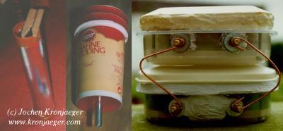 • Yoghurt container (relatively thick, PP) as dielectric, covered with aluminum tape on both surfaces, sandwiched between two more yoghurt containers and gap filled with polyester resin. Some 100pF, more than 30kV.